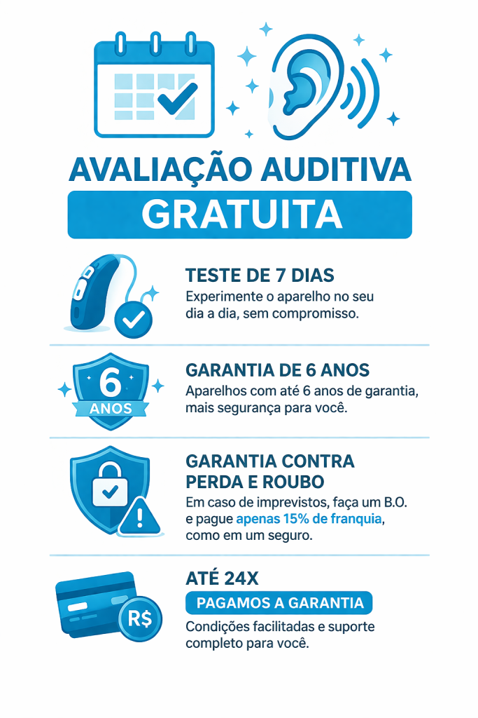 Na Audiotex, você realiza sua avaliação auditiva completa de forma gratuita e ainda pode testar o aparelho por 7 dias no seu dia a dia, sem compromisso. Nossa equipe especializada indica a melhor solução para você com base nas suas necessidades.