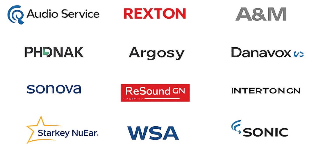 Entre as marcas disponíveis estão Audio Service, Rexton, Aihemen, Phonak, Argosy, ReSound, Danavox, Interton, Starkey (NuEar), além de soluções dos grupos internacionais WSA, Sonova e Sonic (Oticon).